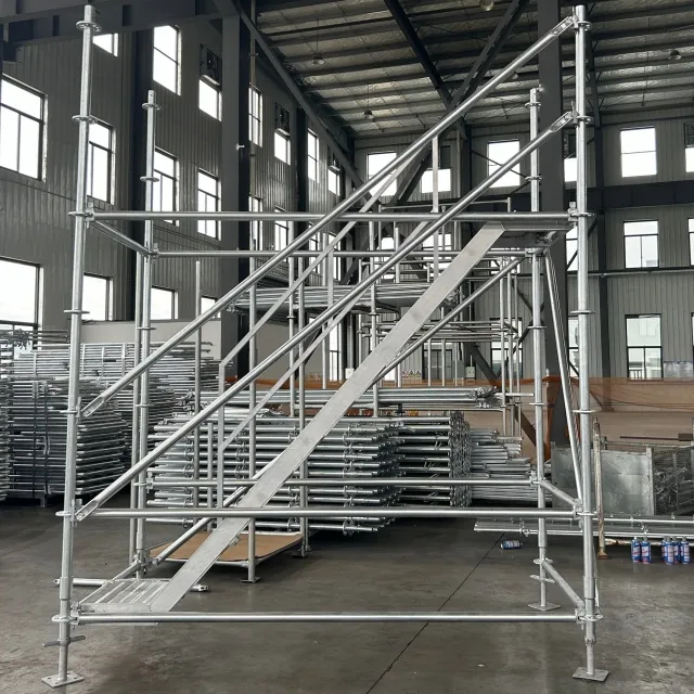 Step 7: Install handrails on the inside of the staircase. Diagonal braces can be used instead of handrails on the outside; the inside requires separate installation. The installation method is similar to that of diagonal braces, connecting them to the ringlock standard.