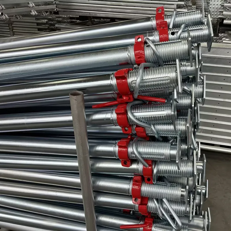 Steel props can take more weight from the concrete than aluminum props. While the cost is much cheaper too. In order to make the shoring posts more durable with longer life, you can ask for hot-dip galvanizing finished scaffold props. HDG post shore jack can be repeated using at least 10 years with rusty.