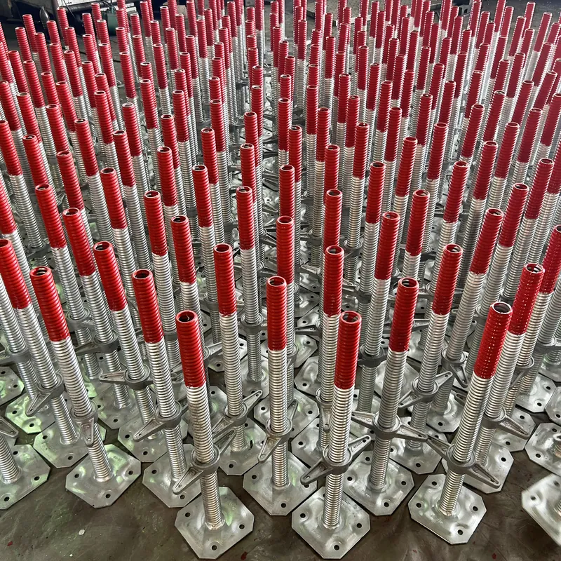 Solid scaffolding jack with base plate in 150*150*5mm or customized, screw rod made from high strength steel rod structure with casting or forging scaffolding jack nut for scaffolding system as ringlock scaffolding, cuplock scaffolding, kwikstage scaffolding, haki scaffolding, tube&fitting scaffolding system and others.
